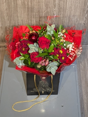 A beautiful gift bag bouquet consisting of long lasting red seasonal flowers and foliage to compliment.