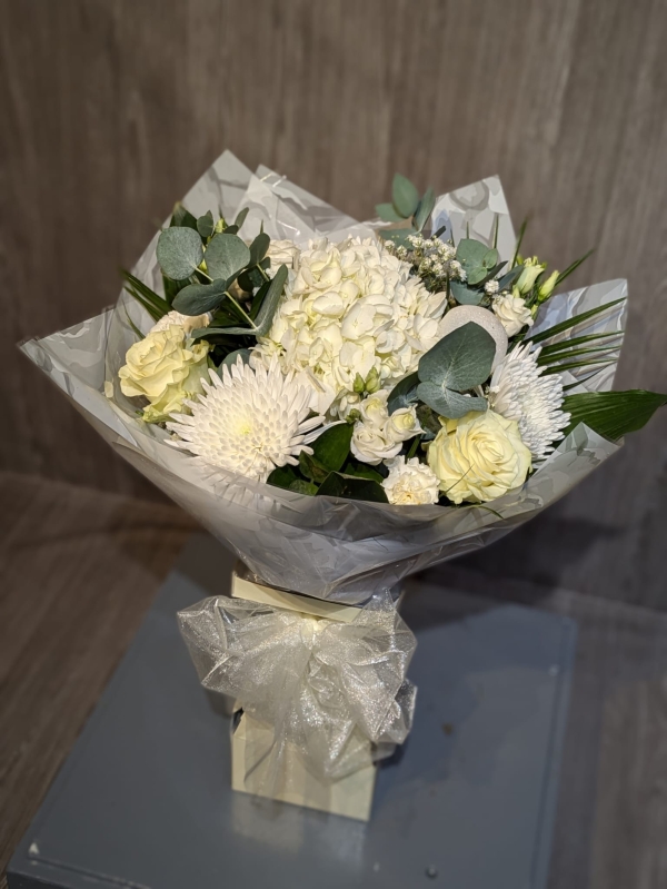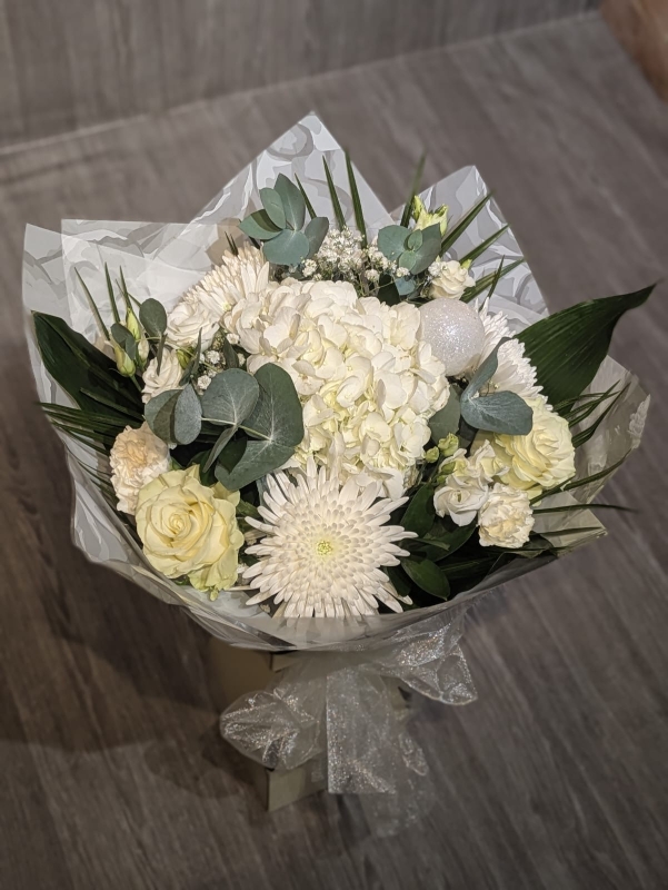 A hand-tie of white flowers presented in a festive floral box with a luxury organza bow. Containing a selection of choice white flowers and seasonal foliages.
