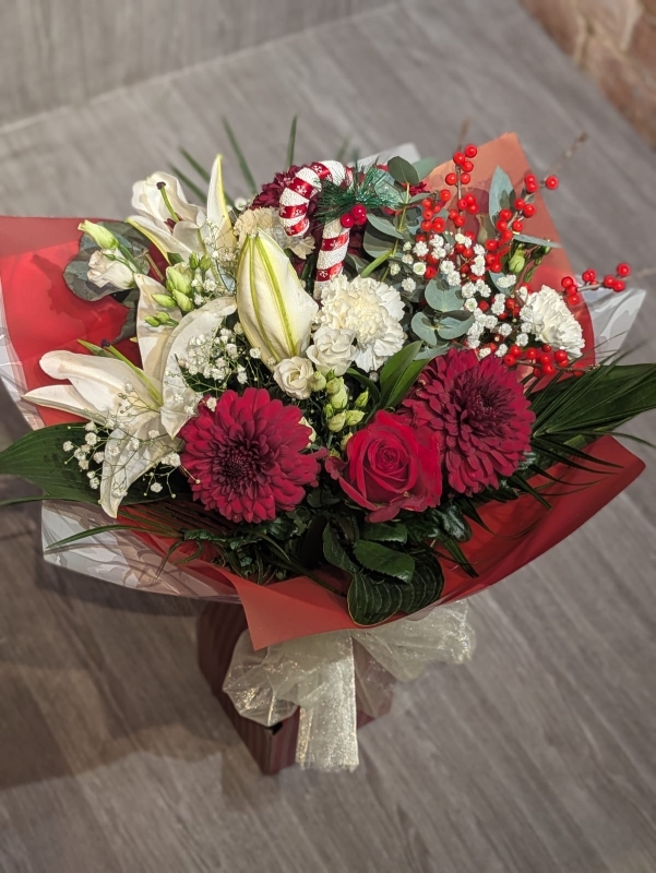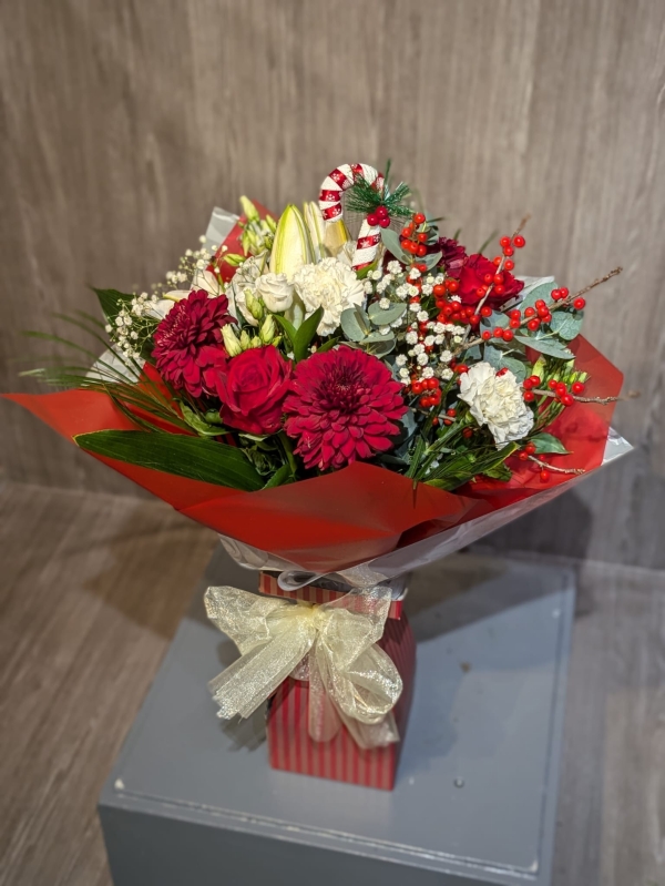A hand-tie of seasonal flowers presented in a festive floral box with a luxury organza bow. Containing a selection of choice red and white flowers with seasonal foliages.