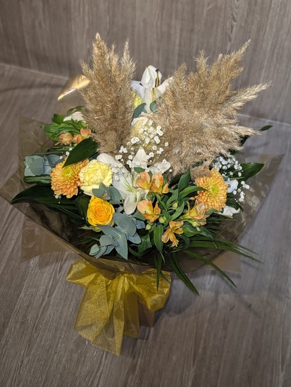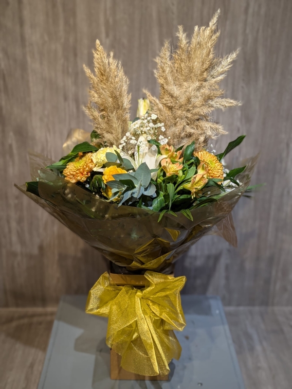 A hand-tie of seasonal flowers presented in a festive floral box with a luxury organza bow. Containing a selection of choice yellow flowers with seasonal foliages.